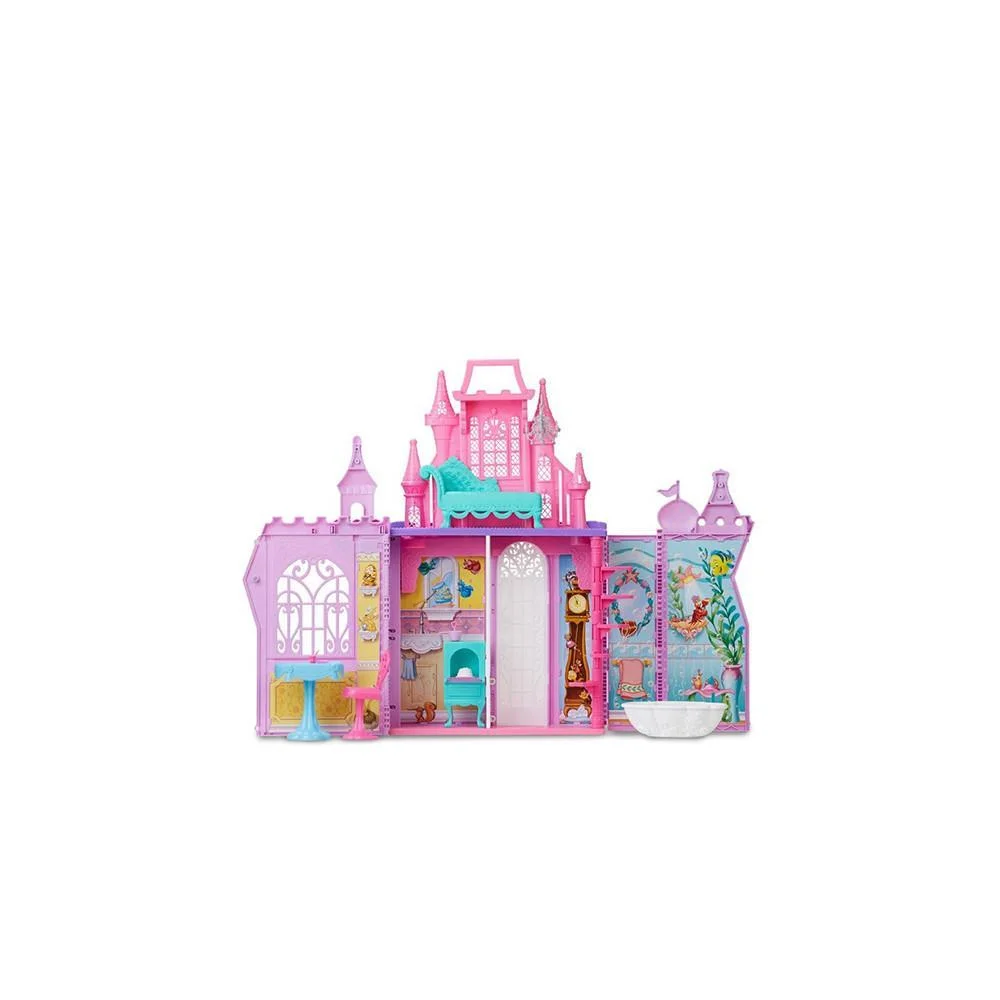 Este castillo cuenta con hermosos detalles y tiene tres funciones: es un juego encantador, un espacio muy útil para guardar accesorios y estuche portátil. Ábrelo y despliega el castillo real con sus distintos ambientes; luego, levanta la manija de la parte superior ¡y descubre otro piso! El castillo viene con 4 áreas temáticas distintas e incluye divertidos accesorios inspirados en las películas de princesas de Disney, como la tina con forma de concha marina, un cómodo asiento real, una cocina y más. Con referencias a varias princesas de Disney, este castillo mágico es un lugar sorprendente para que recrea tus historias favoritas de Disney. ¡Cuando termines de jugar, guarda todos los accesorios en el castillo.